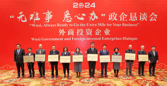 為廣泛聽取企業(yè)意見(jiàn)建議,持續(xù)打響“無(wú)難事 悉心辦”優(yōu)化營(yíng)商環(huán)境品牌,2月23日,無(wú)錫市政府邀請(qǐng)近30家在錫重點(diǎn)外資企業(yè)代表召開懇談會(huì),面對(duì)面傾聽企業(yè)訴求和對(duì)政府工作意見(jiàn)建議,并為“無(wú)錫市十佳外資企業(yè)”頒獎(jiǎng)。我司榮獲該項(xiàng)殊榮,集團(tuán)黨委書記張宏飛代表企業(yè)參加會(huì)議并交流發(fā)言。