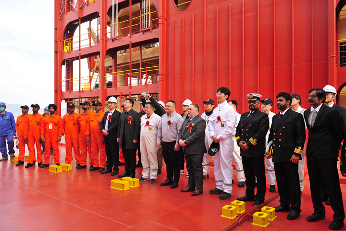 3月9日上午,新船命名人崔佳梅女士,地中海航運(yùn)公司新造船中國(guó)區(qū)經(jīng)理CH Giuseppe Gargiulo先生,我集團(tuán)總經(jīng)理助理兼揚(yáng)子鑫福造船總經(jīng)理?xiàng)钛┫壬?,以及?lái)自DNV船級(jí)社、船東現(xiàn)場(chǎng)監(jiān)造組、船廠方相關(guān)部門(mén)的領(lǐng)導(dǎo)和嘉賓共同見(jiàn)證。崔佳梅女士將新船命名為“MSC IRINA”輪,為新船砍纜并擲香檳禮,拉響汽笛。CH Giuseppe Gargiulo先生與崔佳梅女士為新船送上寄語(yǔ),祝福新船揚(yáng)帆萬(wàn)里,順風(fēng)順?biāo)?,平安啟歸,班班滿載,為各方帶來(lái)榮譽(yù)和財(cái)富。