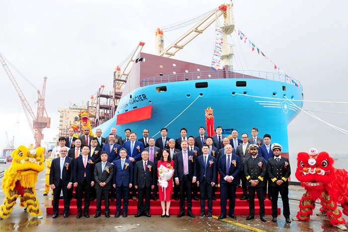 當日,我集團與LEPTA船東共同為新船舉行了隆重的命名儀式。命名人馬士基航運副總裁Peter Lund先生,教母中國農(nóng)業(yè)銀行江蘇分行國際部總經(jīng)理劉艷女士,三井物產(chǎn)株式會社東亞總監(jiān)濱田昭仁先生,中國船舶集團708所副所長朱建璋先生,美國船級社(ABS)中國地區(qū)副總裁Paul Karam先生,克拉克森航運經(jīng)紀公司董事周吉樑先生,以及我集團董事長任樂天先生,集團副總經(jīng)理宋書明先生、副總經(jīng)理杜成忠先生、副總經(jīng)理丁建文先生、副總經(jīng)理周科偉先生等領(lǐng)導和嘉賓共同出席了命名儀式。Peter Lund先生將新船命名為“MAERSKGLACIER”輪,劉艷女士為新船砍纜并擲香檳禮,拉響汽笛,祝福新船、隨船船員航行平安,為船東和租家?guī)順s譽和財富。