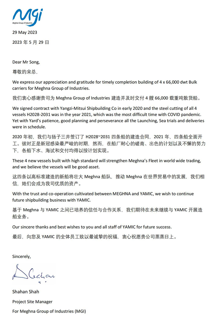 宋書明先生代表船廠進(jìn)行致辭,他表示,“MEGHNA PROGRESS”是揚(yáng)子三井為Meghna集團(tuán)建造的第四艘寬體Ultramax船型散貨船,該船的順利交付與在場各方的積極配合和通力合作密不可分。揚(yáng)子三井將始終保持國際一流的造船質(zhì)量標(biāo)準(zhǔn),不斷提升客戶滿意度和YAMIC品牌競爭力,為船東建造更安全、更環(huán)保、更優(yōu)質(zhì)的船舶。