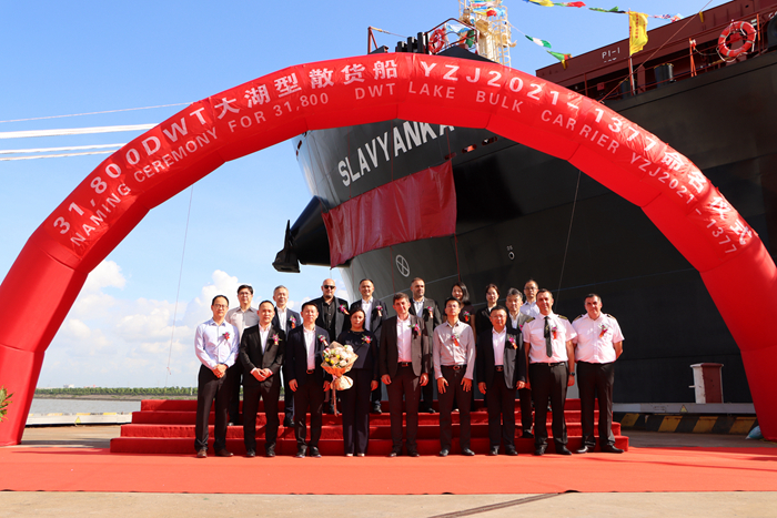 8月2日,揚(yáng)子三井為保加利亞國(guó)家航運(yùn)公司NAVIBULGAR建造的第二艘31800DWT大湖型散貨船“SLAVYANKA”輪(掛馬耳他旗)順利命名交付。新船的命名儀式于揚(yáng)子三井碼頭隆重舉行。教母Katya MilevaMutafova女士將新船命名為“SLAVYANKA”輪,為新船砍纜并擲香檳禮,拉響汽笛,祝福新船、隨船船員航行平安,為船東帶來(lái)榮譽(yù)和財(cái)富。