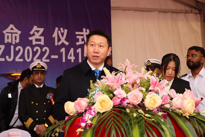 宋書明先生代表船廠致辭,他表示:“該首制船含春節(jié)建造周期約10個月,在此過程中,船東、船級社和船廠都致力于建造一艘優(yōu)質(zhì)高性能船舶,堅信在各方的共同努力下,后續(xù)系列船舶會有更出色的表現(xiàn)。今天,終于迎來為該船命名的重要時刻。感謝船東現(xiàn)場團隊和DNV驗船師的支持和幫助以及參與該船建造的揚子三井造船員工的不懈努力。讓我們繼續(xù)與船東和船級社緊密合作,為建造更安全、更環(huán)保、更具國際競爭力的船舶而努力。我們將按照船東和全球市場的需求,用心打造每一艘船。”