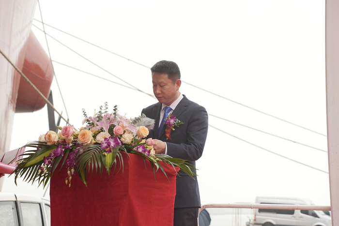 儀式上,揚(yáng)子三井代表宋書明先生表示:今天我們共同迎來了Hartmann第二艘4萬立方米雙燃料液化石油氣/液氨運(yùn)輸船命名交付的歡慶時刻,首先感謝教母倪衛(wèi)芳女士撥冗出席為本船命名。特別感謝Hartmann團(tuán)隊的幫助和支持,感謝與我們密切合作的DNV船級社,感謝每一位為本船作出貢獻(xiàn)的揚(yáng)子三井員工。