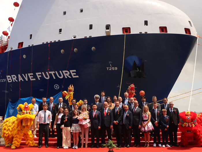 揚子三井代表宋書明先生表示:“繼今年1“Brilliant Future”號成功交付后,我們迎來了第二艘雙燃料LEG運輸船的交付。值此機會,我們衷心感謝BraskemCristiane女士、Hardi先生,以及Ocean YieldAndreas先生。感謝Hartmann集團的Hartmann博士、Adami船長、Ionut Cornea先生、龍葉飛先生,感謝AC-INOXSascha先生。感謝整個Hartmann團隊始終如一的支持,也感謝DNV船級的專業(yè)指導(dǎo)。同時,向所有參與本船建造的YAMIC員工致以誠摯謝意。未來,我們將繼續(xù)與各方緊密合作,為船東研發(fā)建造更加安全、更加綠色、更高性能的綠色能源氣體運輸船產(chǎn)品?!?/span>教母Cristiane Rego女士為新船命名并擲香檳禮,現(xiàn)場鞭炮齊鳴、禮花綻放,汽笛共鳴,龍獅共舞,祝福新船和船員航行平安,勇敢前行,為船東和租家?guī)砗眠\與財富,也為Hartmann、DNV和揚子三井贏得榮耀,帶給所有人勇氣與希望。Hartmann代表Adami Ulrich表示:“衷心感謝揚子三井團隊。揚子三井憑借嚴謹?shù)墓芾砗椭苊艿挠媱?,確保了本船的順利交付。我們對揚子三井未來的發(fā)展充滿信心,也感謝所有為此付出努力的員工?!?/span>Braskem代表Hardi Schuck表示:“正是由于揚子三井在船舶建造過程中的專業(yè)精神與奉獻,讓我們對Brave Future感到無比自豪?!?/span>