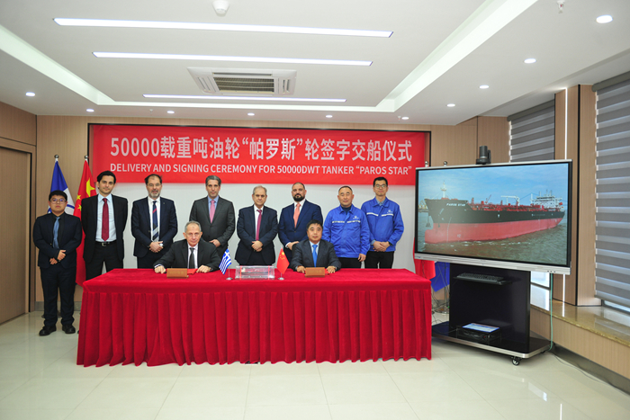 1月9日,在各方代表的共同見證下,船東公司代表Spyridon Papandreou先生與我集團副總經(jīng)理兼新?lián)P子造船總經(jīng)理杜成忠先生分別代表雙方簽署“PAROS STAR”輪交船文件。