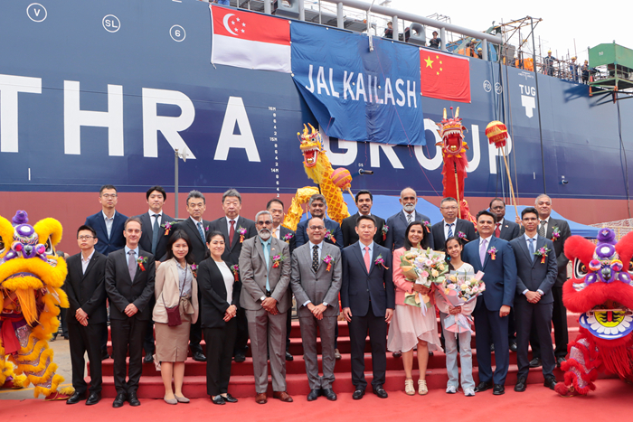 On the morning of May 28, representatives of both parties signed the delivery protocols. On the same day, Yangzi-Mitsui held a grand naming ceremony for the vessel. Godmother Ms. Swati Sharma named the vessel "JAL KAILASH", and then naming sponsor Mr. Sanjay Sharma cut the string and tossed champagne.